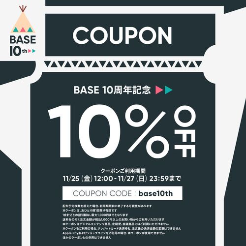 我々TRASHMINDは現在、BASEというサービスを利用してWeb Shopを運営しております。 そのBASEからこの度、2022年11月25日~11月27日の期間限定でご利用いただける「10%OFFクーポン」が発行されております! TシャツやCD、キャップ等販売しておりますので、も…